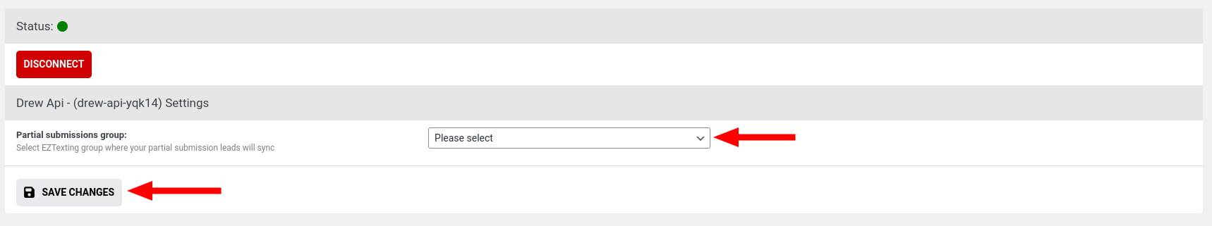 - After connecting your EZTexting account, you'll see a list of your Sweep&Go locations and field to select the group where you want your leads(partial submission to end up)