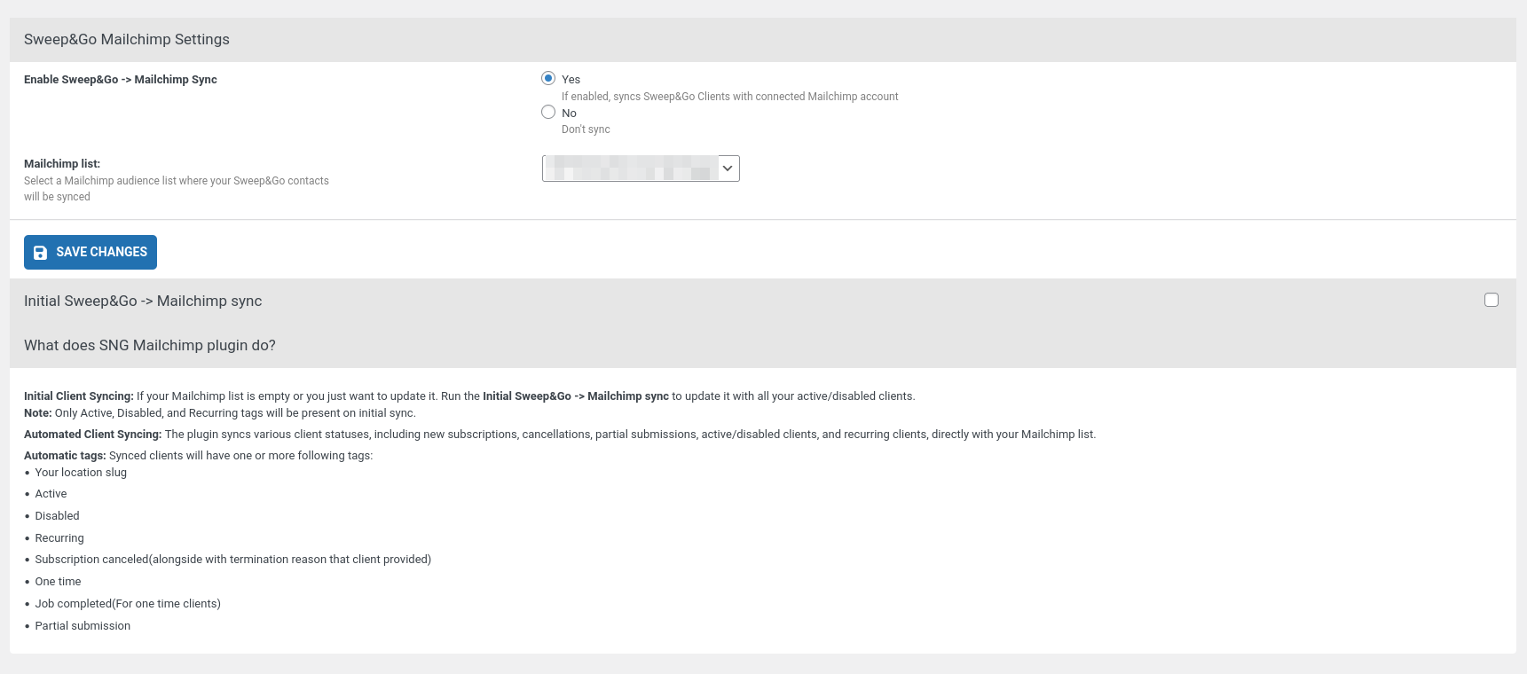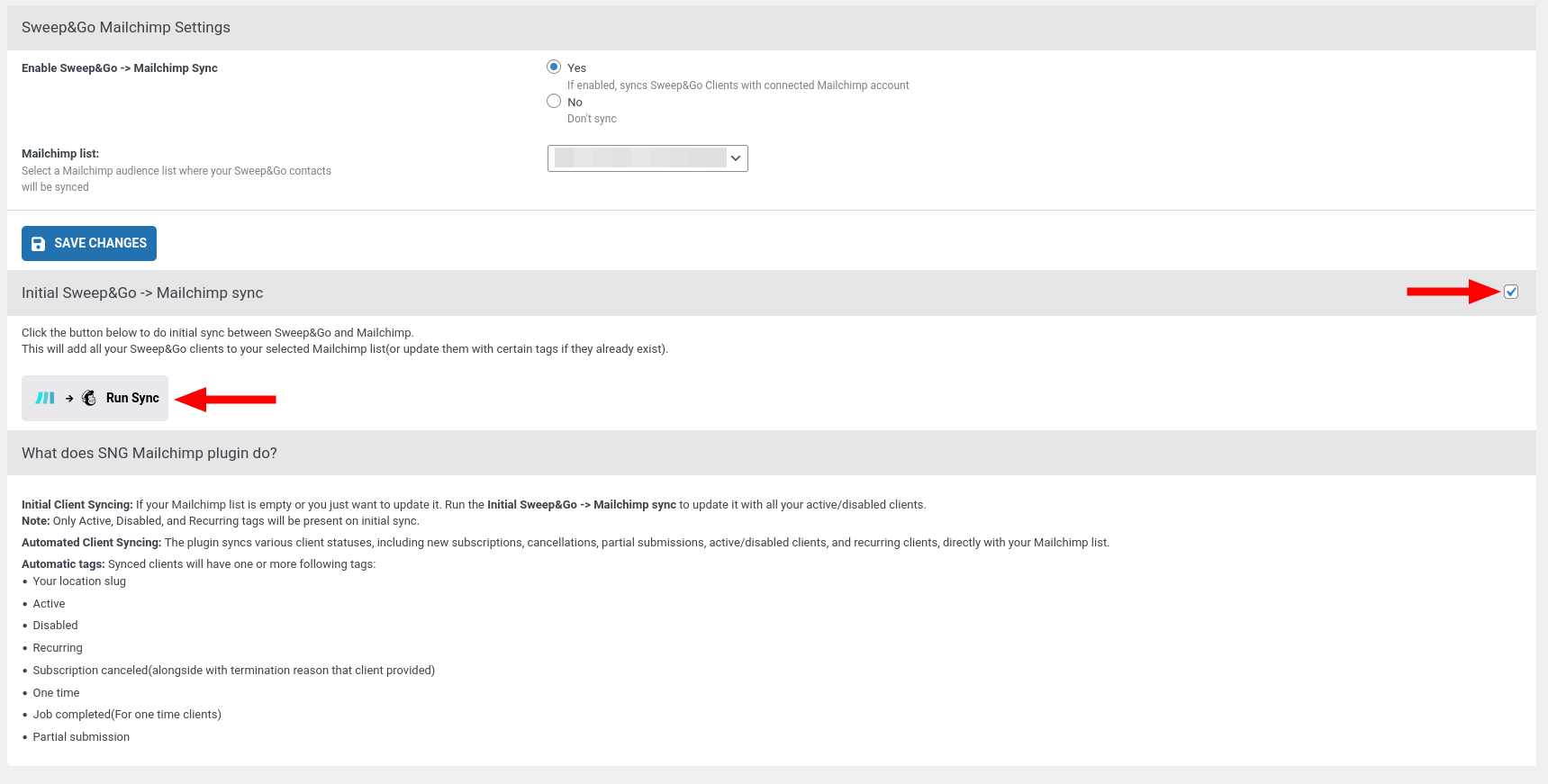 If your list is empty or you just want to update it, you can run the initial sync which will pull all your clients from Sweep&Go and import them into your Mailchimp account