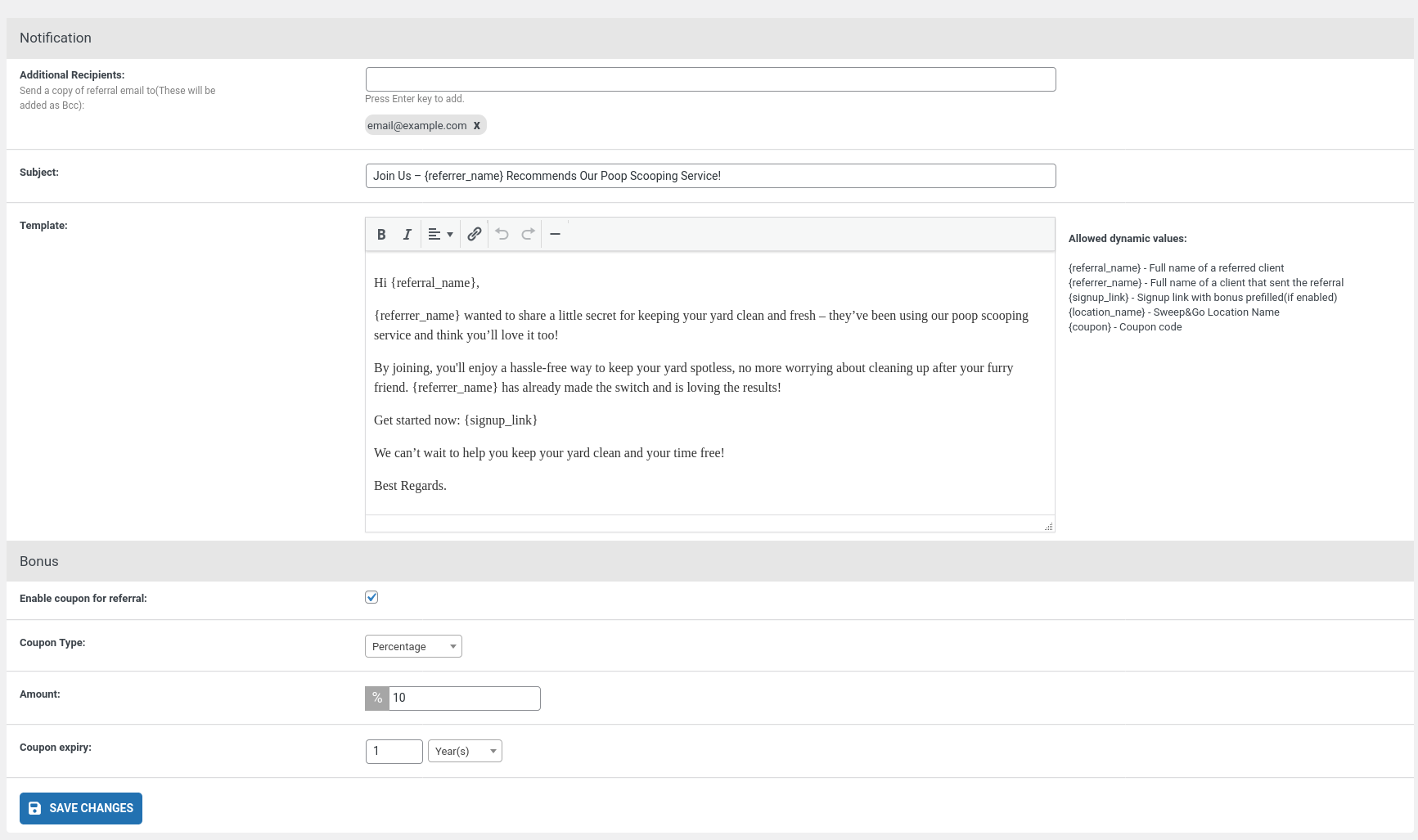 {referral_name}: Full name of the referred client.{referrer_name}: Full name of the client sending the referral.{signup_link}: Signup link with a prefilled bonus (if enabled).{location_name}: Sweep&Go location name.{signup_link}: Link to your onboarding form with coupon automatically applied(if applicable).